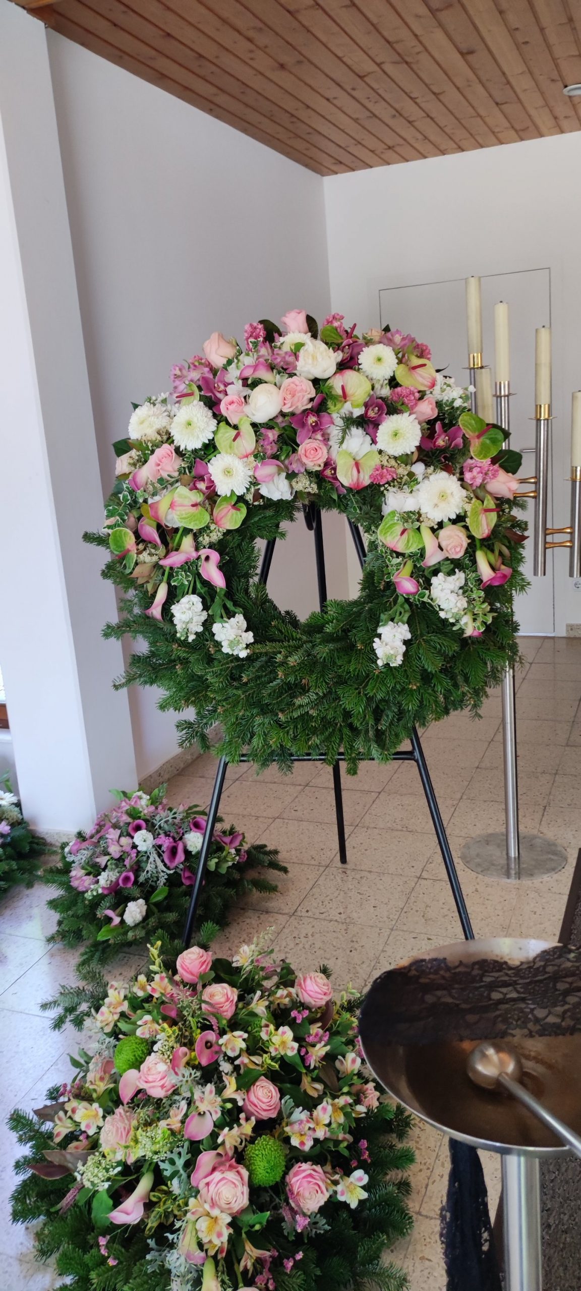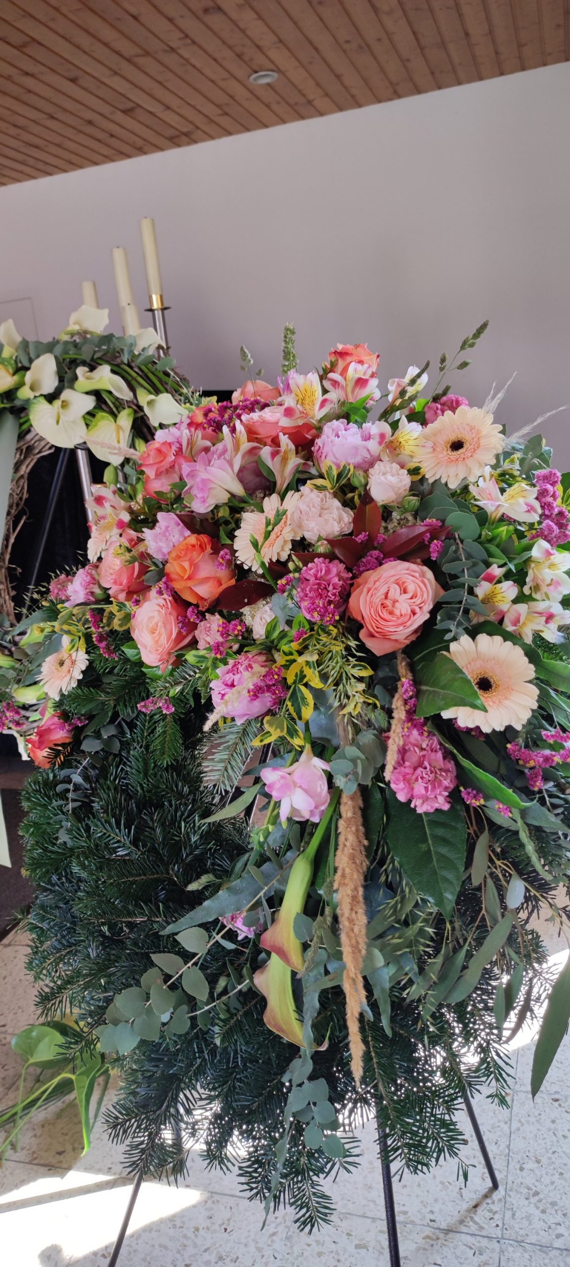 Er ist eine würdevolle Blumenspende. In freundlichem Rosa aus wechselnden Blüten der Saison leuchten die Gerbera immer deutlich hervor.