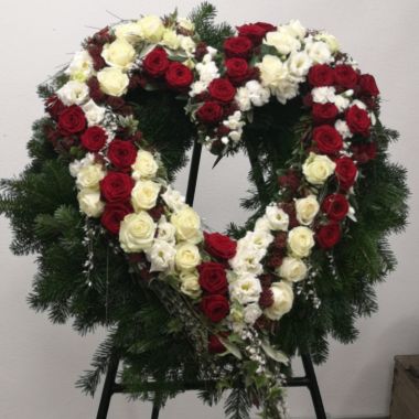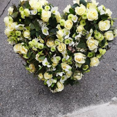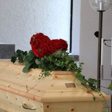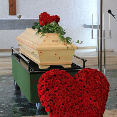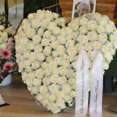 Mit der Auswahl der Blüten und Farben stärken Sie ihre Aussage! Als engster Angehörige, obliegt ihnen der Platz vor dem Sarg. Hier darf natürlich auch ein Herz stehen. Ganz nach Lebensart und Vorlieben gestalte ich dann „ihr Herz“. Ein Gruß auf einer Satinschleife ist gerne möglich.